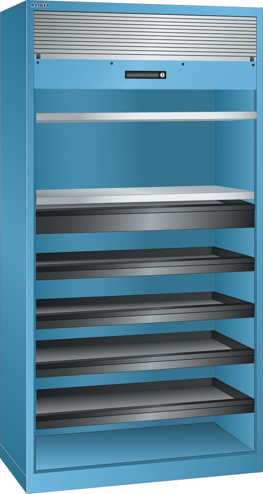 Rollladenschrank, BxTxH 1000x580x1950 mm, 2 Verstellböden, 4 Auszugböden, 1 Schublade, RAL 5012, Rolllade grau