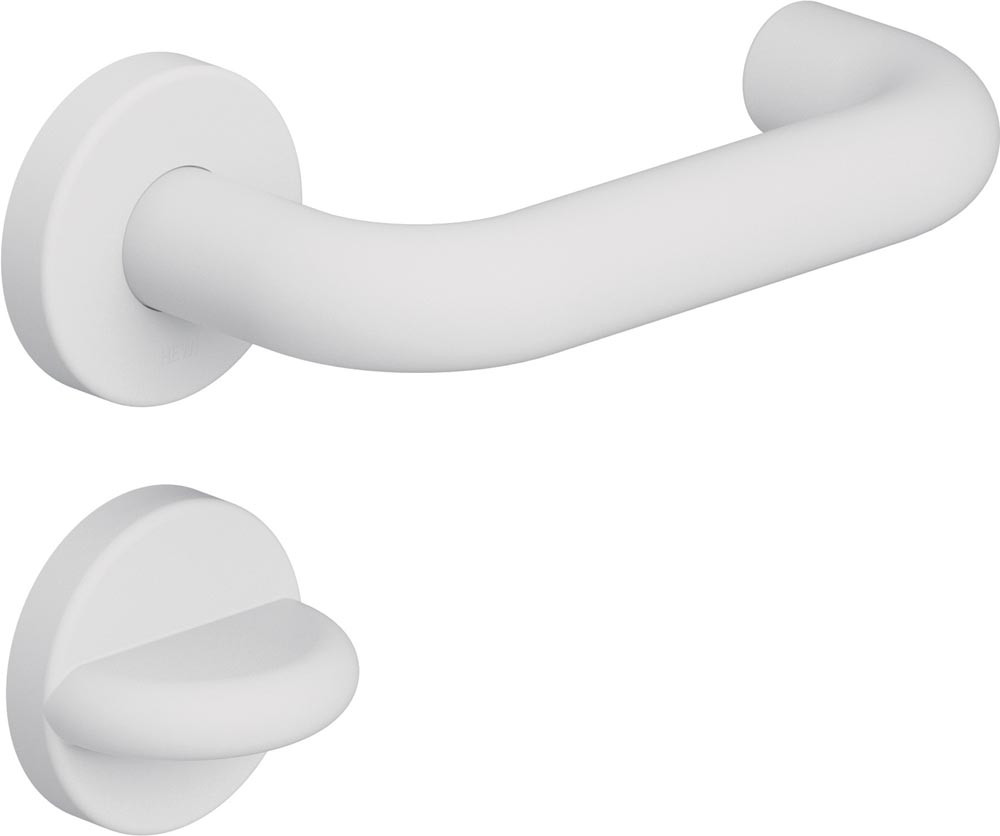 HEWI Frei-Besetzt-Garnitur in R-Technik · nach DIN 18255 und DIN EN 1906 · aus Polyamid · bestehend aus: Türdrücker 111.23PBR, Durchmesser 23 mm und Rundrosetten 305.23PBR und 306.23PBNR · WC-Ausführung mit Schauscheibe (Anzeige rot/weiß) und Notöffnung mittels Münze auf der Außenseite · Vierkant 8 mm · DIN links / rechts · der Drücker erfüllt die Vorgaben der DIN EN 179 und der DIN 18040 · Gebrauchs-Kategorie nach DIN EN 1906 - Klasse 4 · Edition matt