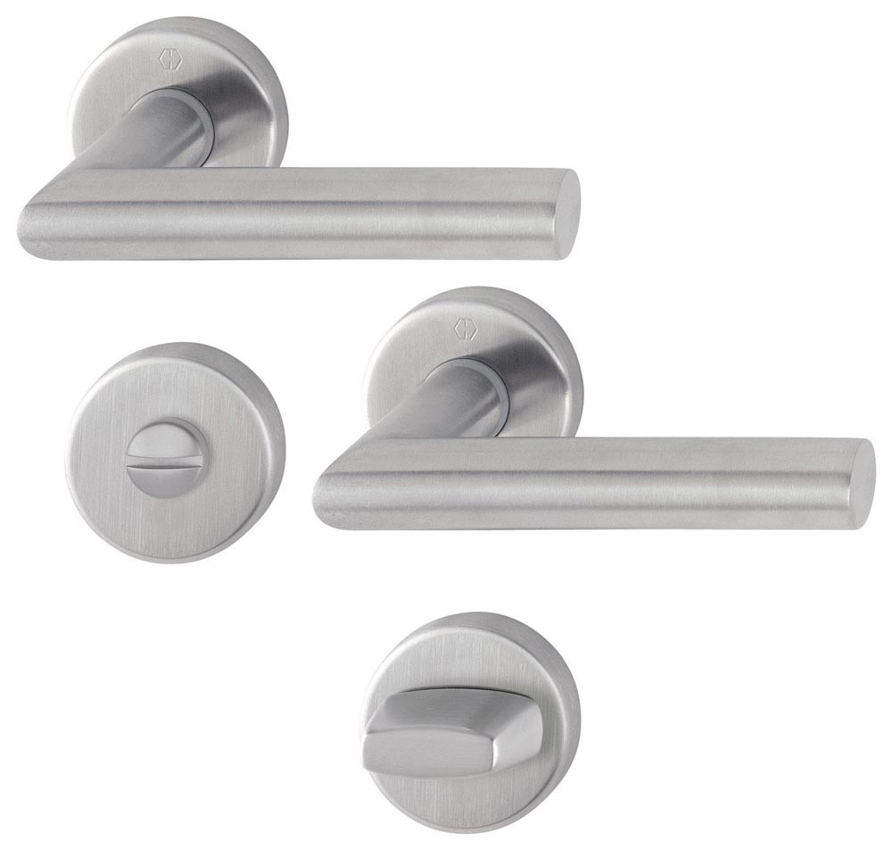 HOPPE-Edelstahl-Rosetten-Türgriff-Garnitur mit Schlitzkopf/Olive und Rot/Weiß-Scheibe für Bad/WC-Türen, geprüft nach DIN EN 1906: 37-0140A, Objekt-Garnitur, Lagerung: Türgriffe lose, Rückholfedern rechts/links verwendbar, wartungsfreie, Gleitlager, Verbindung: HOPPE-Schnellstift mit HOPPE-Vollstift (Stift-/Lochteil), Unterkonstruktion: Kunststoff, Stütznocken, Befestigung: verdeckt, durchgehend, wechselseitig, Mehrzweckschrauben