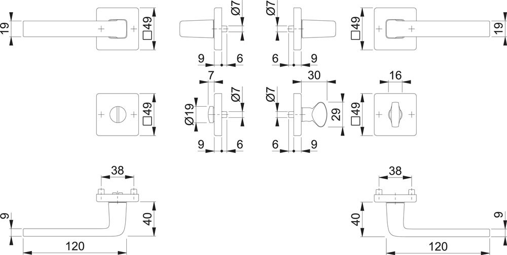 Lagerung: Türgriffe fest/drehbar, Rückholfedern, wartungsfreie Gleitlager