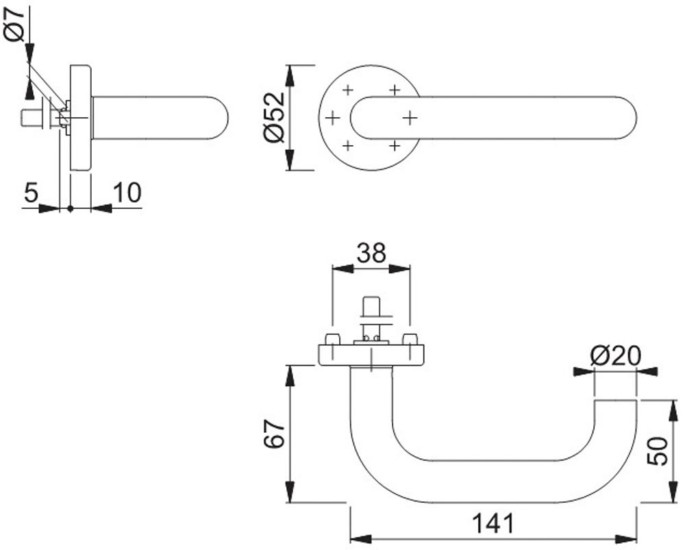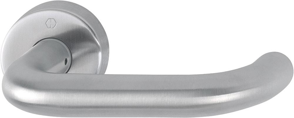 Edelstahl-Rosetten-Türgriff-Halbgarnitur mit Rosetten-Montagemodul, ohne Schlüsselrosette, für Außentüren (Innenseite)· Lagerung: Türgriff lose, Rückholfeder rechts/links verwendbar, wartungsfreies Gleitlager · Verbindung: Schnellstift-Verbindung mit Vollstift, vormontiert in der Unterkonstruktion · Unterkonstruktion: Stahl, Stütznocken, für Aluminium-, Holz- und Kunststofftüren · Befestigung: verdeckt, zusätzliche 4-fach diagonale Befestigungsmöglichkeit, für Mehrzweckschrauben