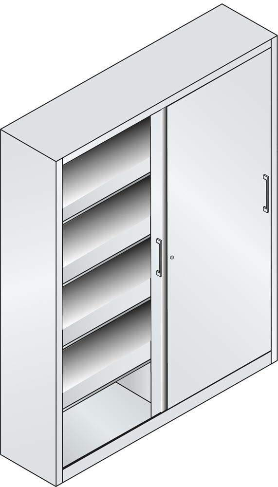∙ Verschweißte Stahlblechkonstruktion mit hochwertiger Einbrennlackierung ∙ Schiebetüren mit Spezialkugellagerrollen in stabiler Schienenführung ∙ Aufsatzschränke gleichschließend mit Grundschrank auf Wunsch lieferbar ∙ Verchromter Bügelgriff, Dreh-Druckzylinderschloss inkl. 2 Schlüsseln ∙ In Korpusfarbe lackierte Fachböden im Raster von 15 mm höhenverstellbar · Traglast pro Fachboden 70 kg (bei gleichmäßig verteilter Last)