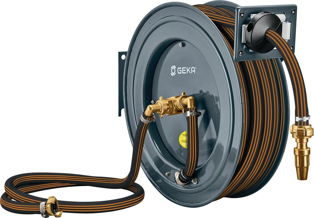 GEKA® plus Automatischer Schlauchaufroller · pulverbeschichtete Stahlkonstruktion · automatischer Rückzug des Schlauchs · für Wand-, Boden- und Deckenmontage · fertig montiert und einsatzbereit · schwenkbare Wandhalterung separat erhältlich