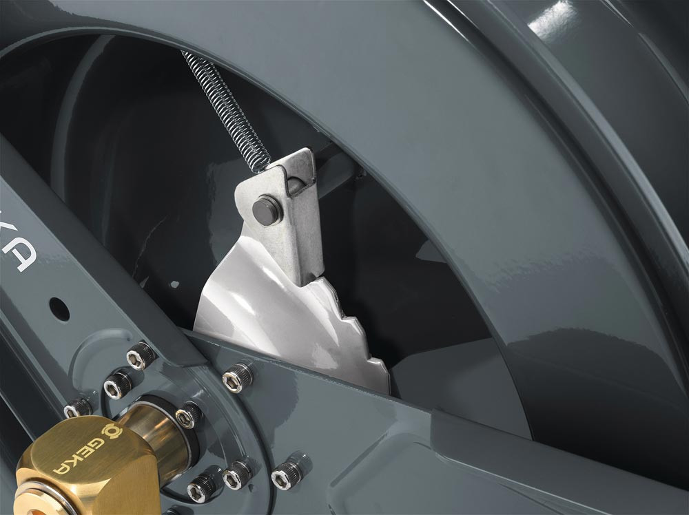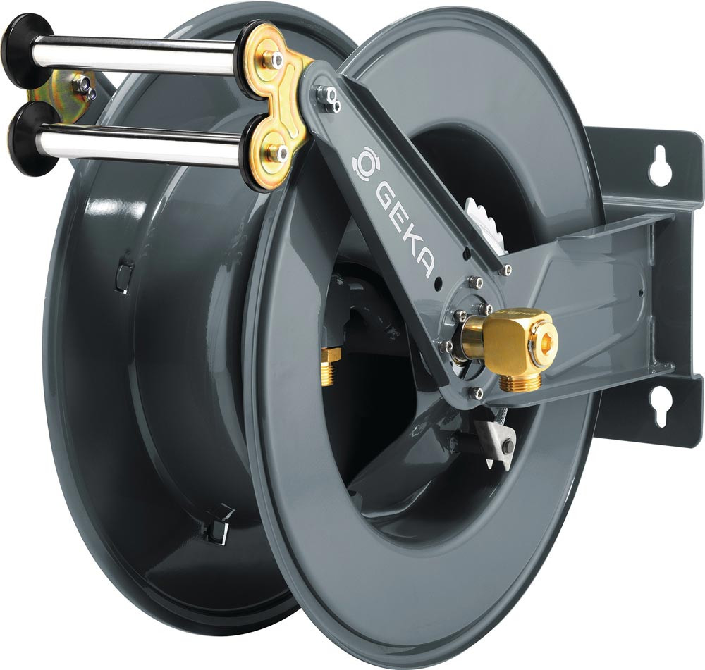 automatischer Rückzug des Schlauchs · schrittweise Arretierung aus der Distanz durch Zug am Schlauch möglich · geeignet für Wasser · mit Schlauchschutz und Schlauchstopper · mit GEKA® plus Winkeldreharmatur 90° aus Messing