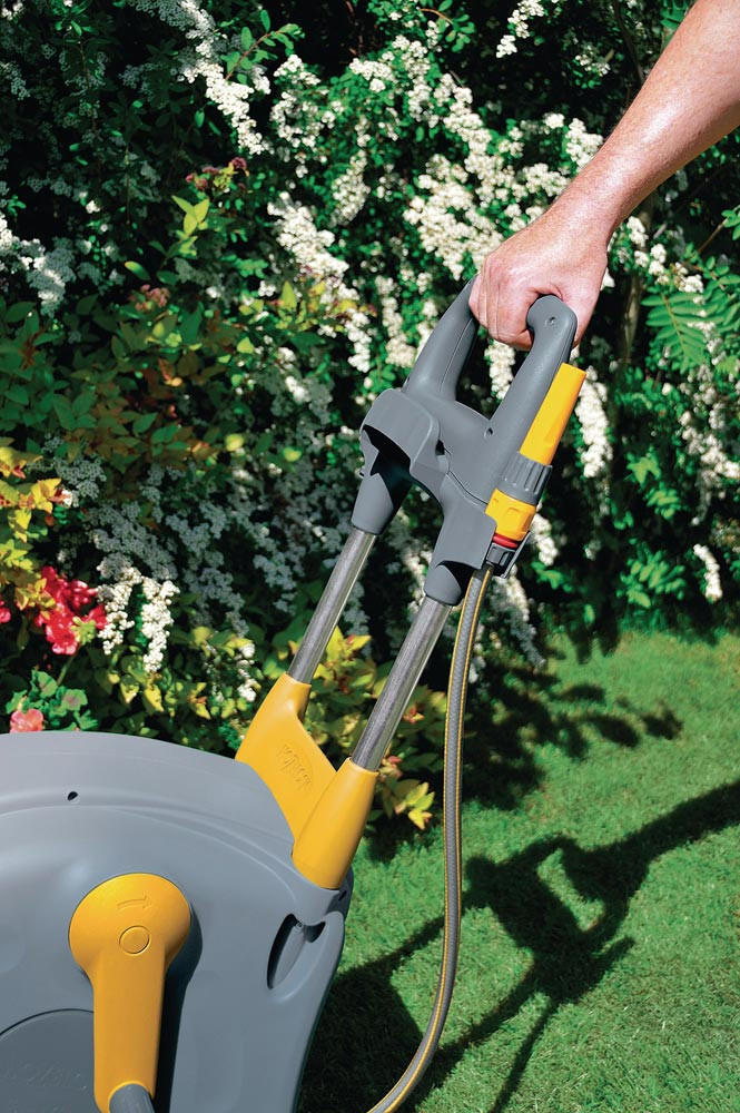 standsicherer und leicht transportierbarer Schlauchwagen mit einer geschlossenen Schlauchbox · ausgestattet mit 40 Meter Schlauch · leichtes, sauber und ordentliches Aufrollen des Schlauches mit seinem innovativen "Easy Rewind" Aufroll System mit automatischer Schlauchführung