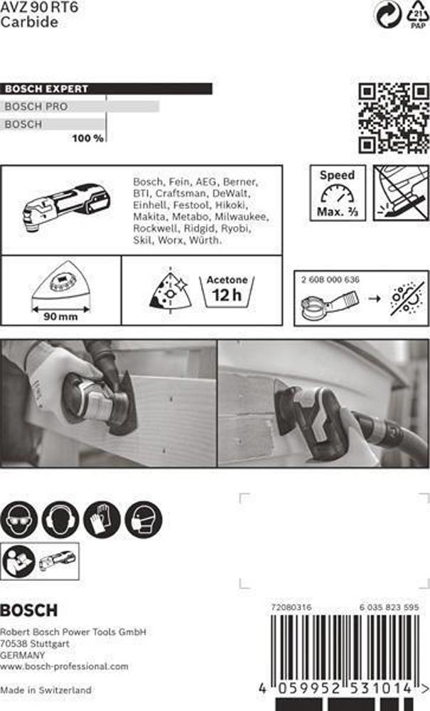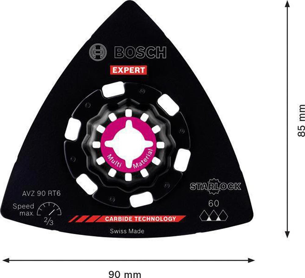 für Multifunktionswerkzeuge · hohe Lebensdauer beim Schleifen von Material verschiedener Art und Anwendungszwecke · mit Bosch Carbide Technology · scharfe Korn mit langer Lebensdauer, da es mit Lösungsmittel gereinigt werden kann · Starlock Aufnahme für maximale Kraftübertragung und bequemen Klingenwechsel