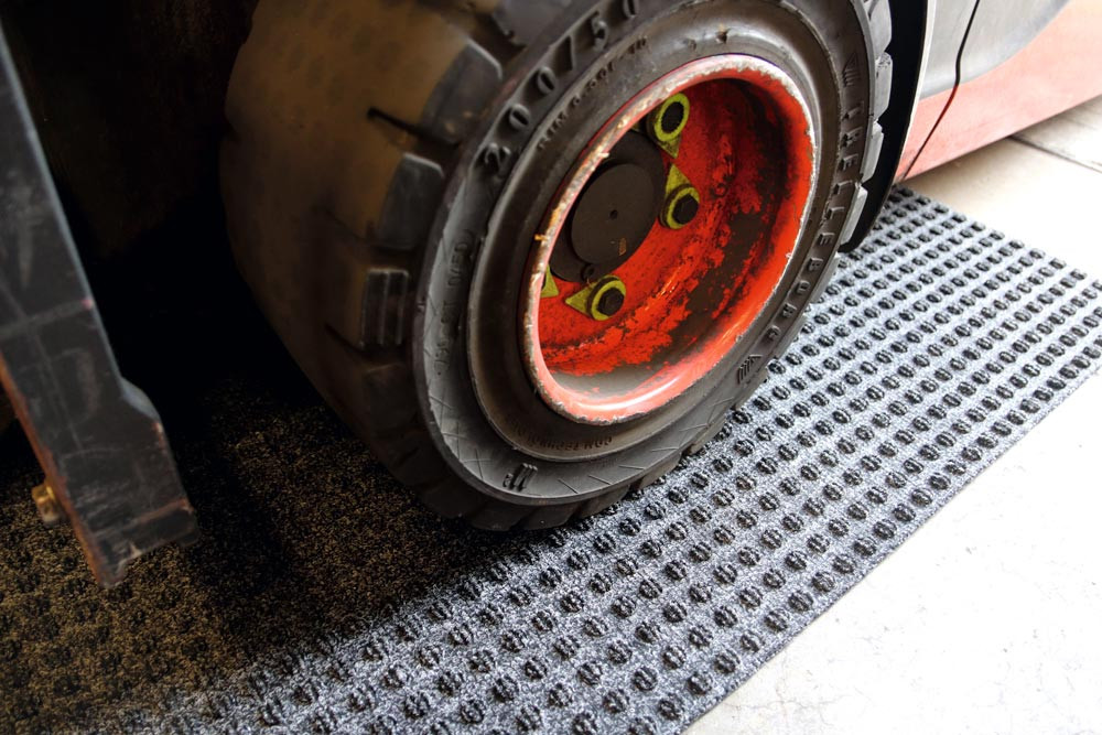 · Waffelmuster absorbiert Feuchtigkeit und entfernt Schmutz von den Staplerrädern · Reduziert die Rutschgefahr durch eindringendes Wasser · Reduziert das Risiko, dass Gabelstapler schleudern oder auf kontaminierten Bodenflächen die Kontrolle verlieren · Hilft, die Reinigungskosten bei schlechtem Wetter niedrig zu halten · Große Matten können einzeln oder nebeneinander verlegt werden, um größere Flächen abzudecken · Schützt den Unterboden · Einfache Reinigung mit dem Staubsauger oder einer festen Bürste · Doppelseitiges Klebeband zur einfachen Montage im Lieferumfang enthalten