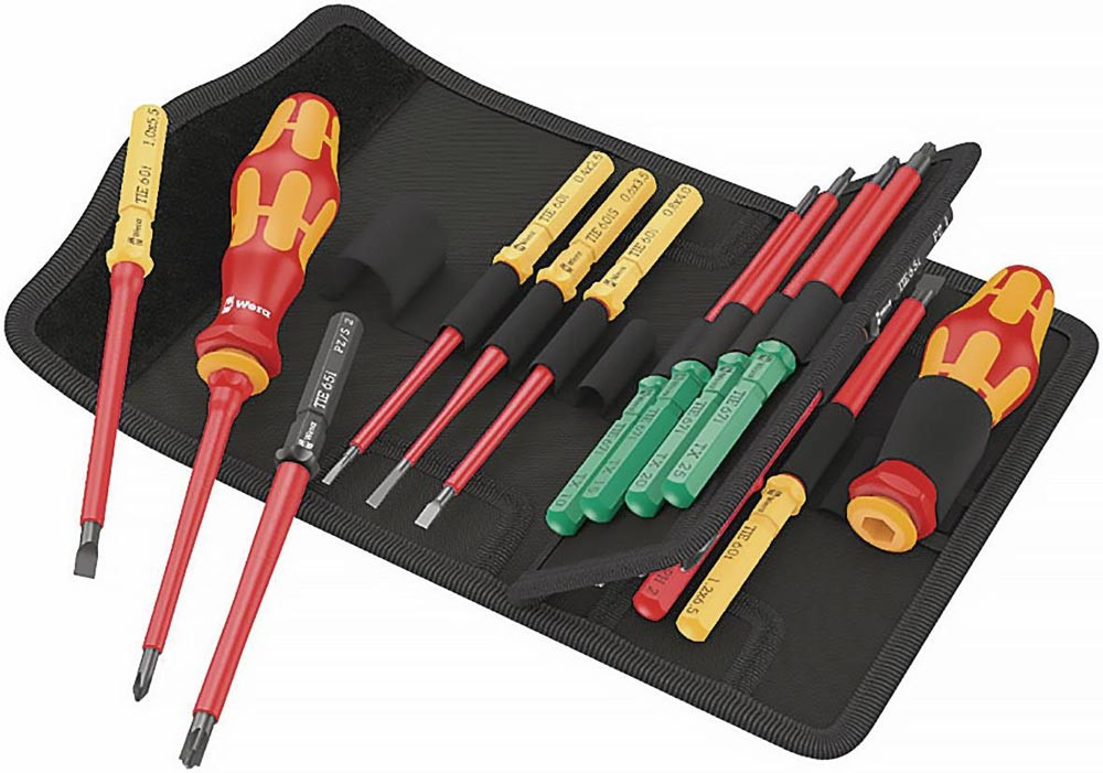 aufgelaserte Größenangabe · mit reduziertem Klingendurchmesser, um auch tiefliegende Schraub- und Federelemente erreichen zu können · Stückprüfung im Wasserbad bei 10.000 V für sicheres Arbeiten bei einer zugelassenen Spannung von 1000 V · textile Tasche mit Flauschzone auf der Rückseite · dank selbsthaftendem Klebestreifens kann die Tasche an die Wera 2go Komponenten geklettet werden