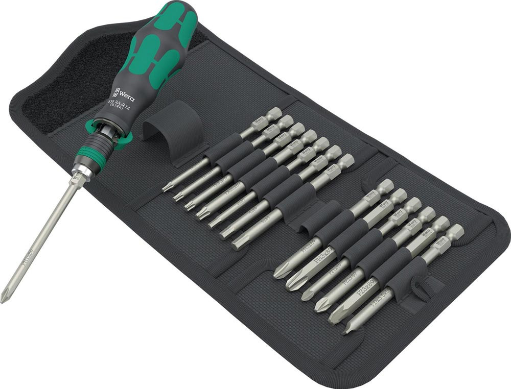 15-teilig · Bits-Handhalter mit intuitiv bedienbarer Ratschenfunktion · im Griff integrierte Ratschenmechanik mit Feinverzahnung (36 Zähne/Rückholwinkel 10°) vereinfacht und beschleunigt das Schrauben ohne mühsames Neuansetzen · ollständig im Griff eingebettete Knarrenmechanik sorgt für sehr handliches und angenehmes Arbeiten · ergonomisches Umschalten auf Rechts-/Links- oder 0-Position · Kraftform Plus Griff für angenehm ergonomisches Arbeiten · magnetischer Bithalter für Bits mit 1/4" · Außensechskantantrieb nach DIN ISO 1173-C 6,3 und E 6,3 (ISO 1173) · Schnellwechselfutter Rapidaptor ermöglicht blitzschnellen Bitwechsel ohne Hilfswerkzeug · starke Dauermagnet hält die Bits bombenfest