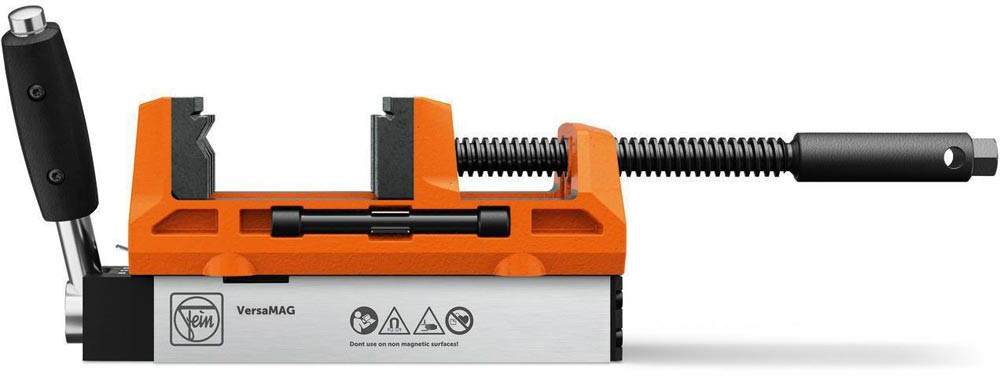 Permanentmagnet mit Schraubstock zum werkzeuglosen Spannen auf magnetischen Oberflächen, auch im Dünnblechbereich ab 4 mm Stärke · mobiles Modularsystem für sicheren Halt · Spannen in engen Räumen oder vertikalen Ebenen · wechselbare Spannbacken zum Spannen von größeren Materialien wie Bleche und Rohre · präzise Ausrichtung mithilfe einer 30%-igen Vormagnetisierung