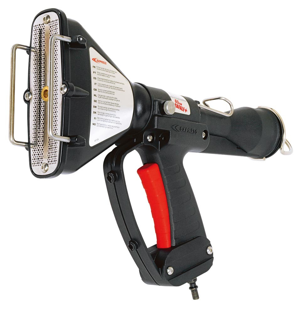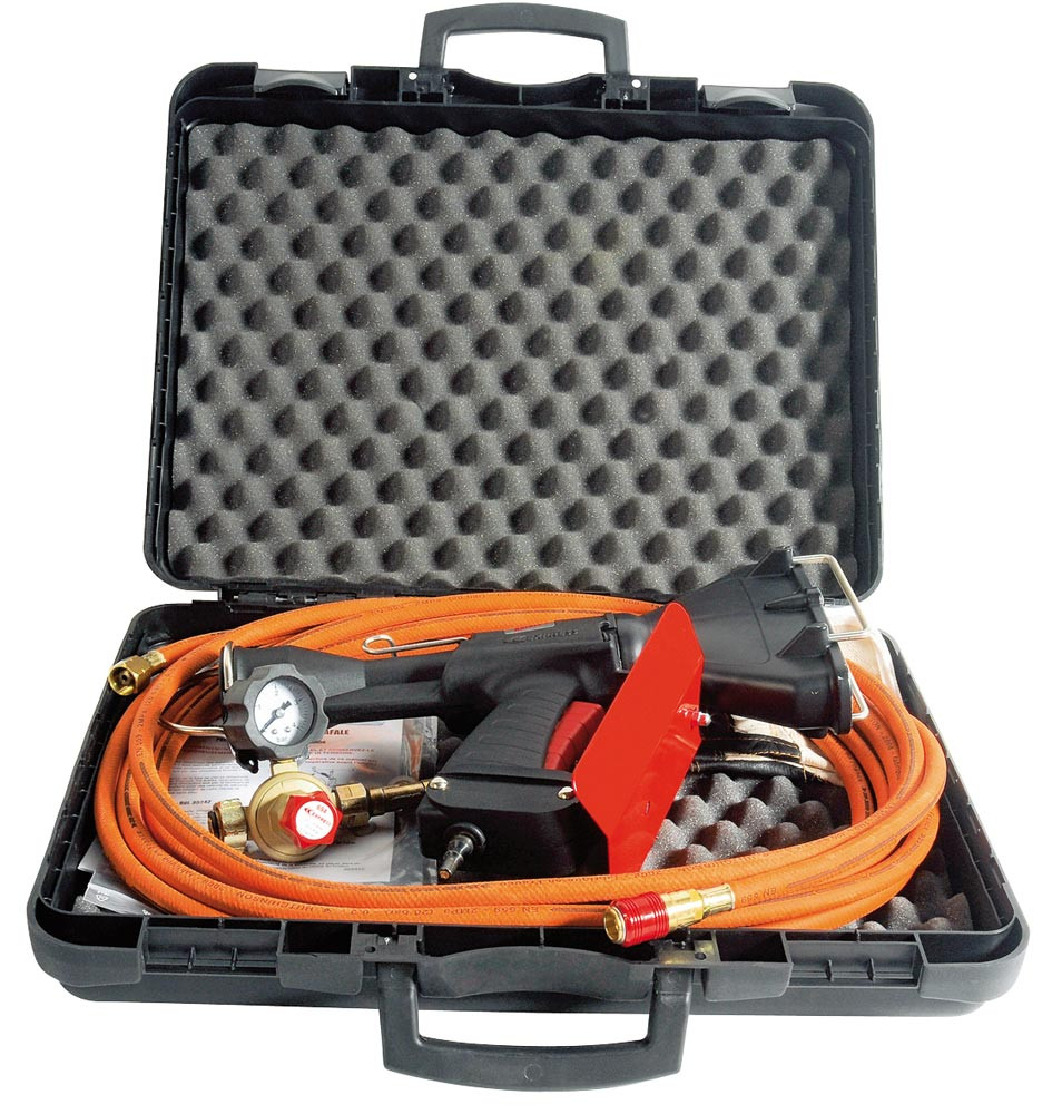 Schrumpfpistole, Einsteiger-Set, Sicherheitsdruckregler, 8 m Propangas-Hochdruckschlauch, Koffer, Druckminderer, Nennwärmebelastung 65 kW, Gewicht 1,2