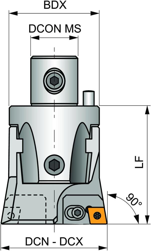 Verlängerung Typ Spindelbohrkopf Größe 85 mit 90° Anstellwinkel und synchronisierte Einstellung zum Schruppen in einem Durchmesserbereich von 100 bis 125mm · zum Erweiterung mit 3CT 90 402 Verlängerung zum spannen von CC.. 1204.. Wendeschneidplatten für Längsbohrung mit und ohne Schulter