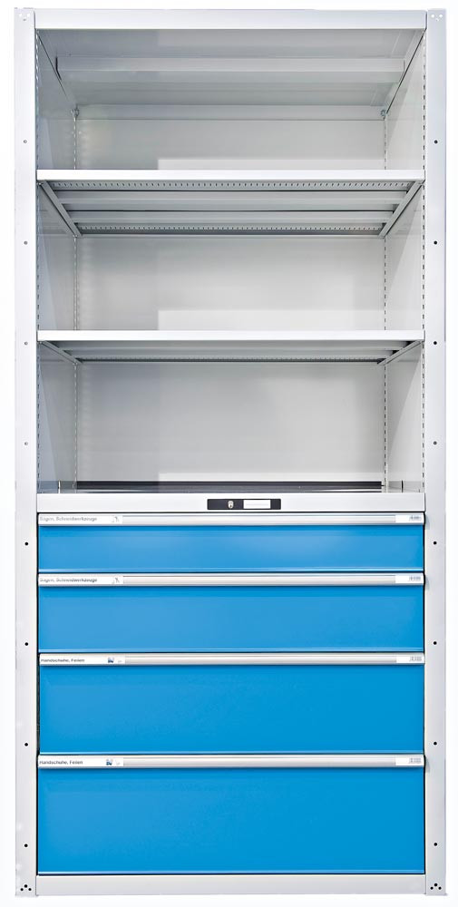 Schubladenregal, Anbaufeld, 3 Universal-, 2 Verstellböden, 4 Schubladen, BxTxH 1117x706x2200 mm, RAL 7035/5012 EP514964