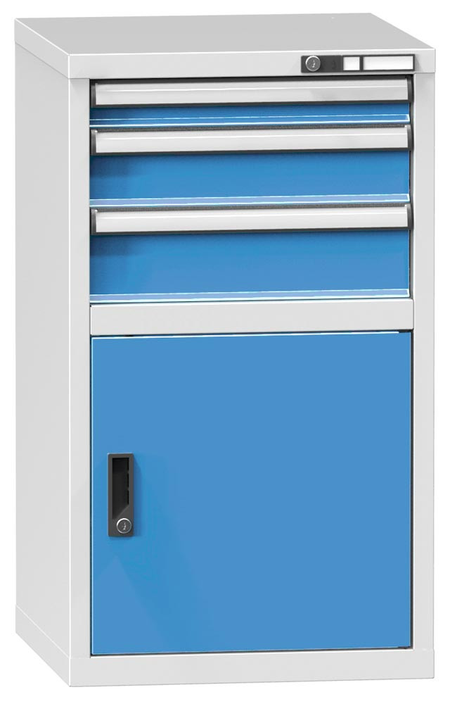 Schubladenschrank, 3 Schubladen: 1x75, 1x125, 1x150 mm, 1xTür 550 mm, 1xFachboden, BxTxH 578x600x990 mm, RAL 7035/5012
