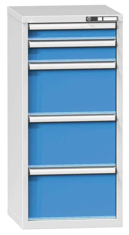 Schubladenschrank, 5 Schubladen: 1x75, 1x100, 1x125, 1x200, 1x250 mm, BxTxH 578x600x840 mm, RAL 7035/5012 EP516787