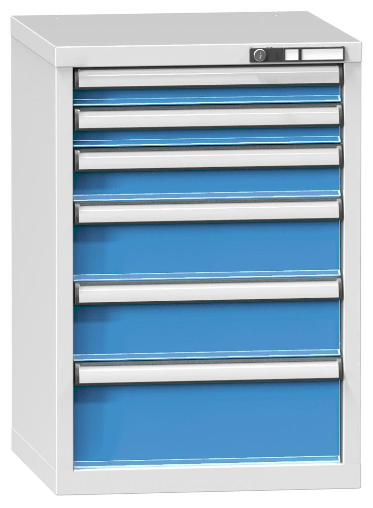 Schubladenschrank, 6 Schubladen: 1x75, 1x100, 1x125, 2x150, 1x300 mm, BxTxH 578x600x990 mm, RAL 7035/5012 EP528899