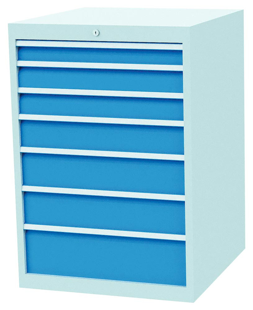 Schubladenschrank, 7 Schubladen,1x75,2x100,1x125,2x150,1x200mm, Zylinderschloss, BxTxH705x736x1019mm, RAL7035/5012