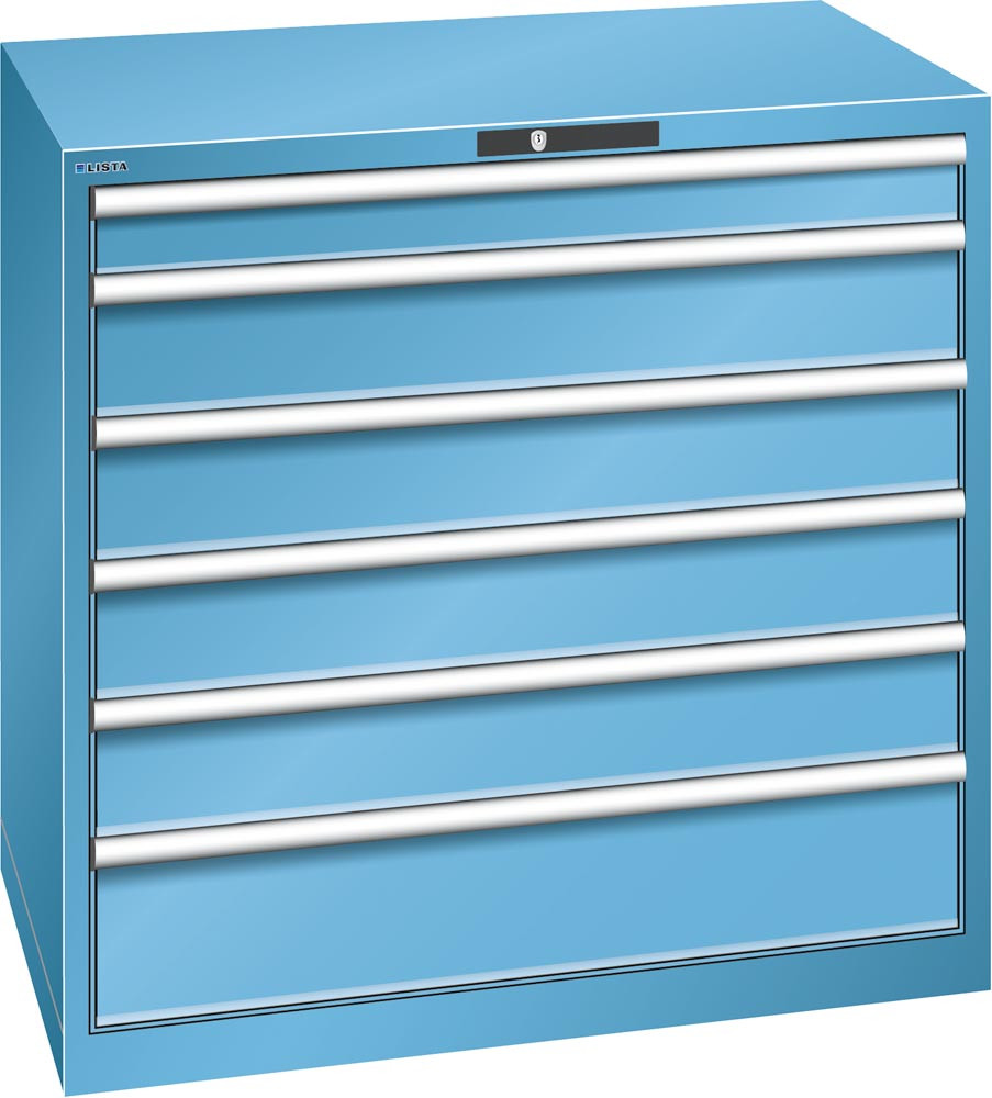 Schubladenschrank, Traglast/Schubl.: 200 kg, 6 Schubladen 100, 4x150, 200 mm, Zylinderschloss, BxTxH 1023x725x1000 mm, RAL 5012 EP525974