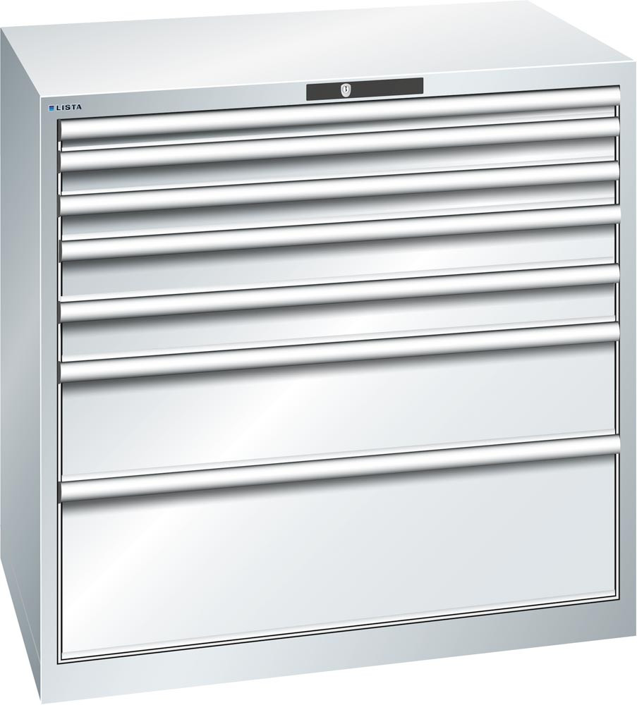 Schubladenschrank, Traglast/Schubl.: 75 kg, 7 Schubl.: 1x50, 2x75, 2x100, 1x200, 1x300 mm, Zylinderschloss, BxTxH 1023x725x1000 mm, RAL 7035 EP529101