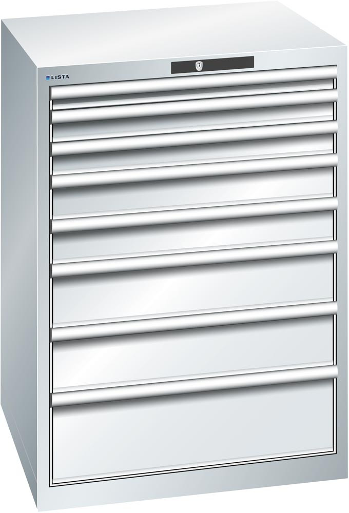 Schubladenschrank, Traglast/Schubl.: 75 kg, 8 Schubladen: 50, 2x75, 2x100, 2x150, 200 mm, Zylinderschloss, BxTxH 717x725x1000 mm, RAL 5012 EP525962