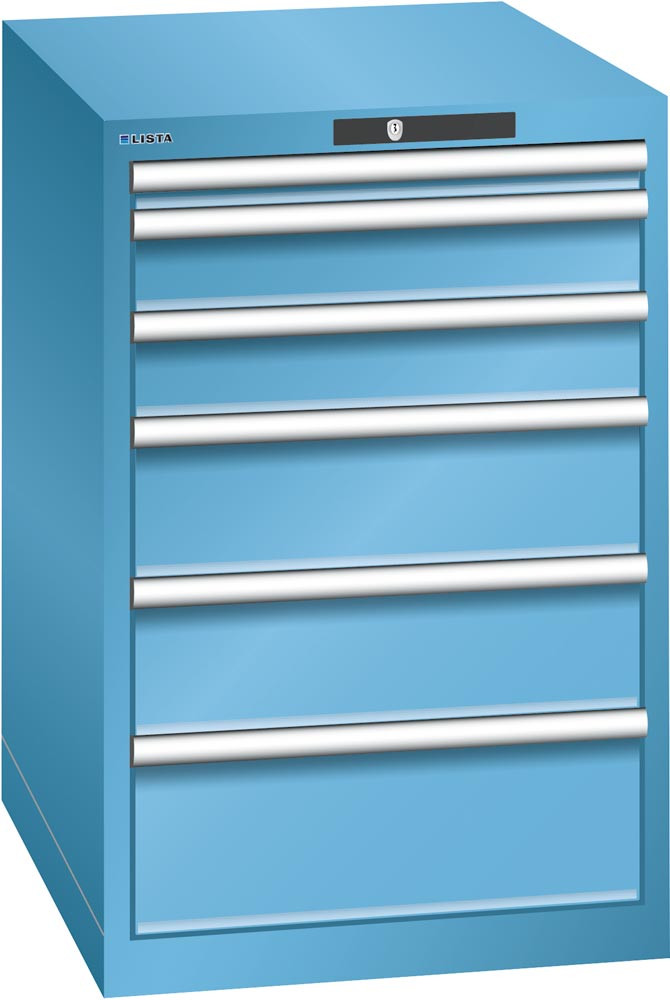 Schubladenschrank, Traglast/Schubl.: 75 kg, 6 Schubladen: 1x50, 2x100, 2x150, 1x200 mm, Zylinderschloss, BxTxH 564x725x850 mm, RAL 5012 EP525944