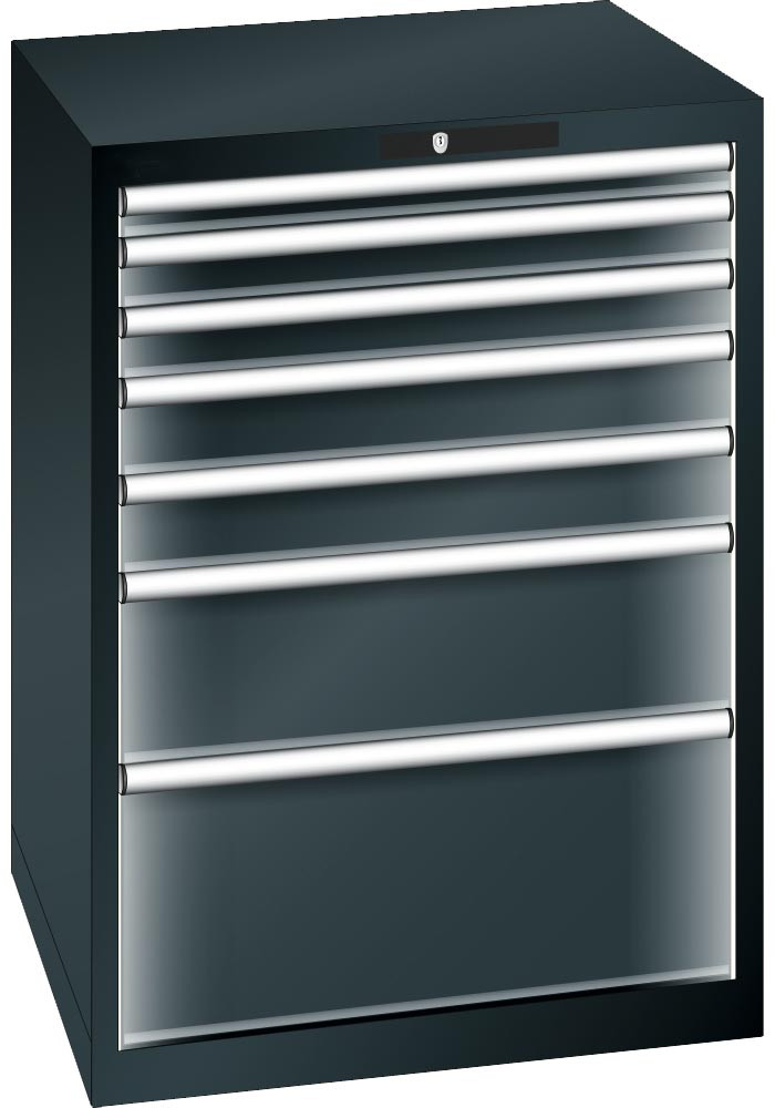 Schubladenschrank, Traglast/Schubl.: 75 kg, 7 Schubladen: 1x50, 2x75, 2x100, 1x200, 1x300 mm, Key Lock, BxTxH 717x725x1000 mm, schwarz, mit LED