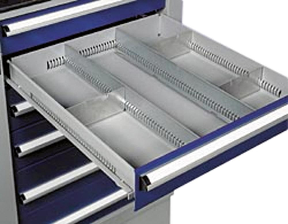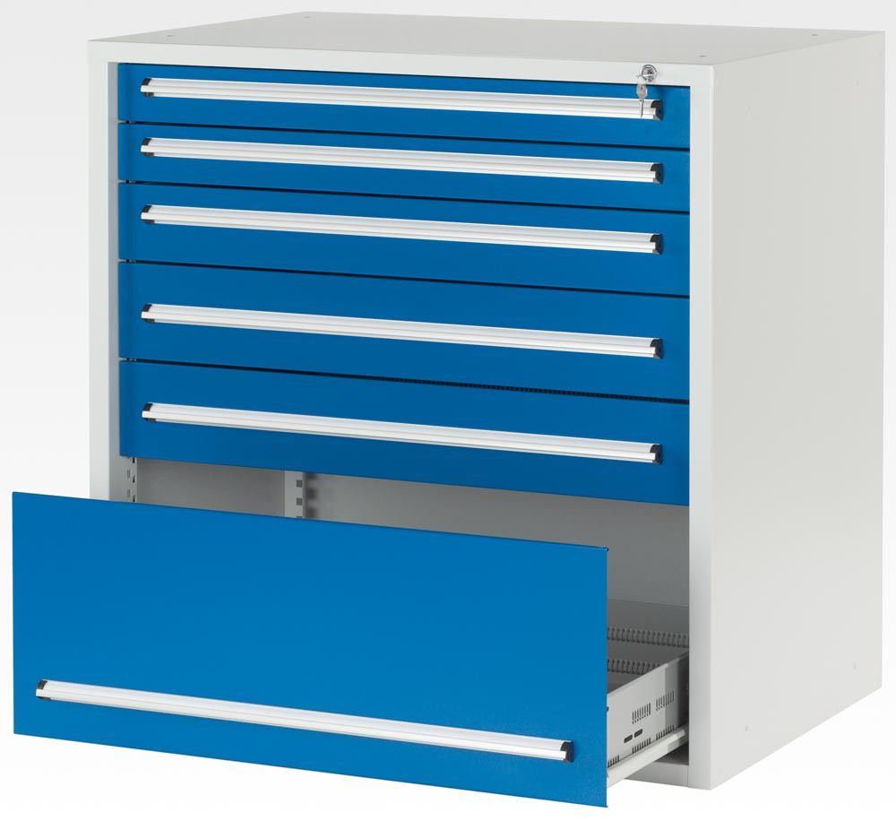 Ausführung: Robuste, verschweißte Stahlblech-Konstruktion, pulverbeschichtet für höchste Belastbarkeit ∙ 6 Schubladen mit 85% Teilauszug ∙ Tragkraft pro Schulade 100 kg - mit Schlitzreihen zur Aufnahme von Einteilungsmaterial ∙ Zentralverriegelung mit Sicherheitsschloss und Einzelauszugssperre ∙ Griffleisten aus Aluminium mit Beschriftungsstreifen und Klarsichtabdeckung ∙ Farbe RAL 7035 lichtgrau/RAL 5010 enzianblau