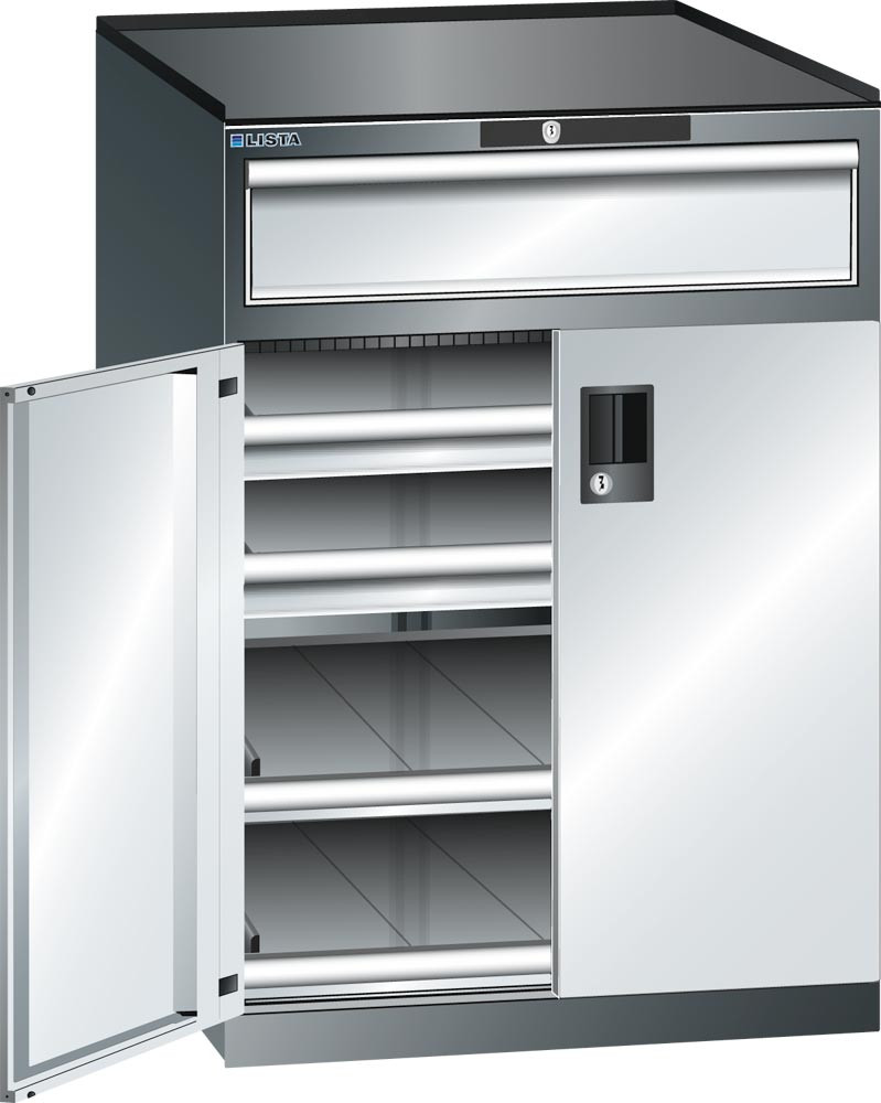 ∙Aus hochwertigen pulverbeschichteten Stahlblech ∙ Flügeltüren, einschlagend aus einem Stück gekantet, Öffnungswinkel 115 ° schließen bündig mit dem Gehäuse ab ∙ Inneneinrichtung in 25 mm Raster in der Höhe verstellbar ∙ Mit Zylinderschloss