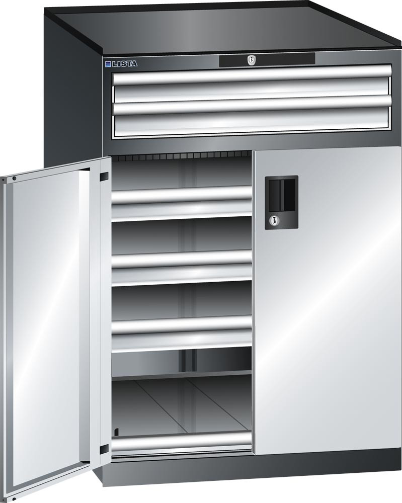 Schubladenschrank m. Flügeltüren, BxTxH 717x753x1020 mm, Schubladen: 5x75 u. 1 Auszug 200 kg, Schloss, RAL 7035 EP534170