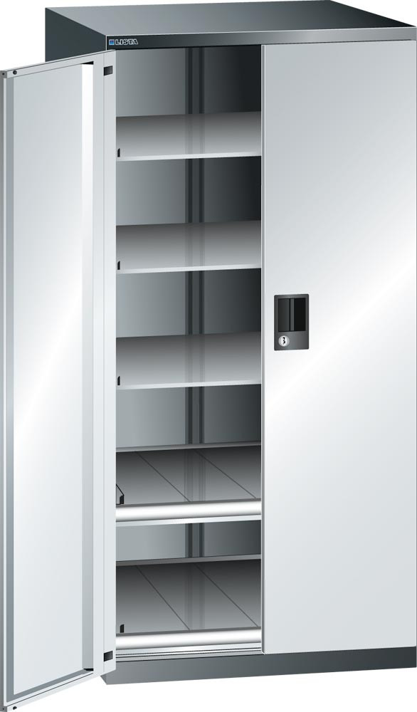 ∙Aus hochwertigen pulverbeschichteten Stahlblech ∙ Flügeltüren, einschlagend aus einem Stück gekantet, Öffnungswinkel 115 ° schließen bündig mit dem Gehäuse ab ∙ Inneneinrichtung in 25 mm Raster in der Höhe verstellbar ∙ Mit Zylinderschloss