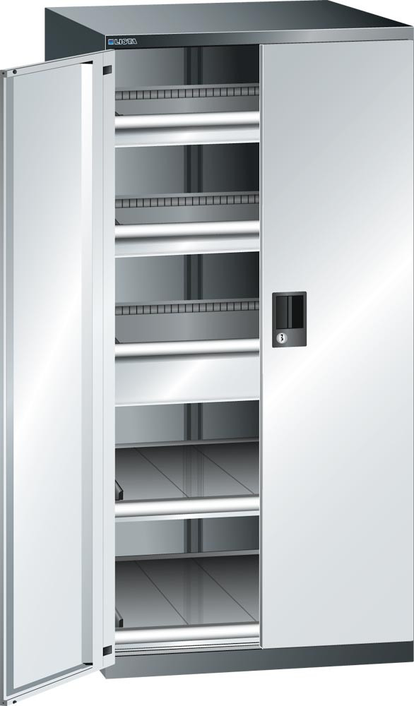∙Aus hochwertigen pulverbeschichteten Stahlblech ∙ Flügeltüren, einschlagend aus einem Stück gekantet, Öffnungswinkel 115 ° schließen bündig mit dem Gehäuse ab ∙ Inneneinrichtung in 25 mm Raster in der Höhe verstellbar ∙ Mit Zylinderschloss