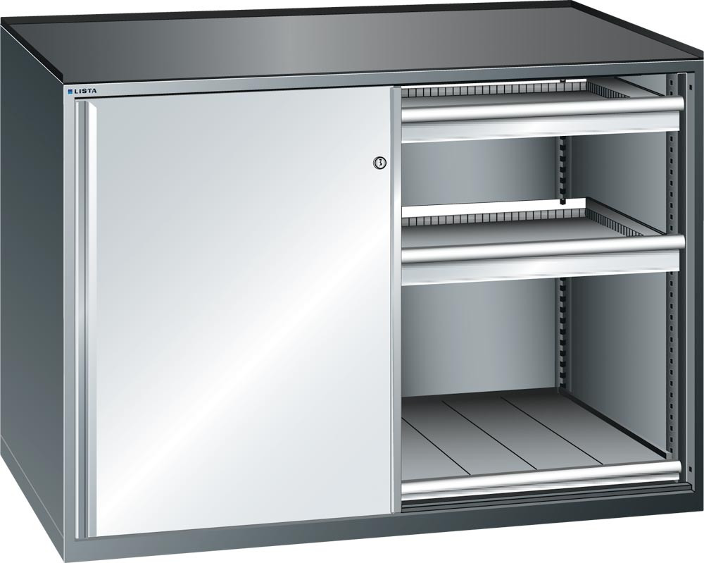 ∙ Aus hochwertigem, pulverbeschichtetem Stahlblech ∙ Optimal bei engen Raumverhältnissen ∙ Schiebetüren mit einer hohen Laufruhe ∙ Inneneinrichtung im 25 mm Raster in der Höhe verstellbar ∙ Mit Zylinderschloss ∙ Abrollrand 3-seitig inkl. Rillenmatte