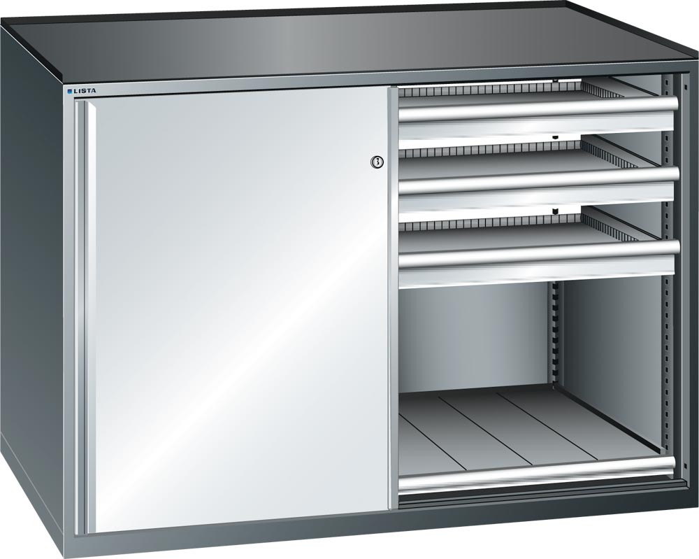 Schubladenschrank m. Schiebetüren, BxTxH 1430x627x1020 mm, 6 Schubladen 200 kg u. 2 Auszüge 200 kg, Schloss, RAL 7035 EP534197