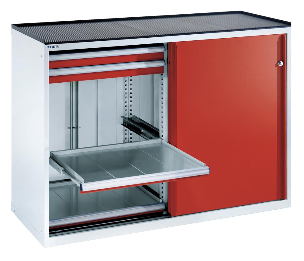 Schubladenschrank m. Schiebetüren, BxTxH 1430x780x1020 mm, 4 Schubladen 75 u. 4 Auszüge 75 kg, Schloss, RAL 5012 EP534218