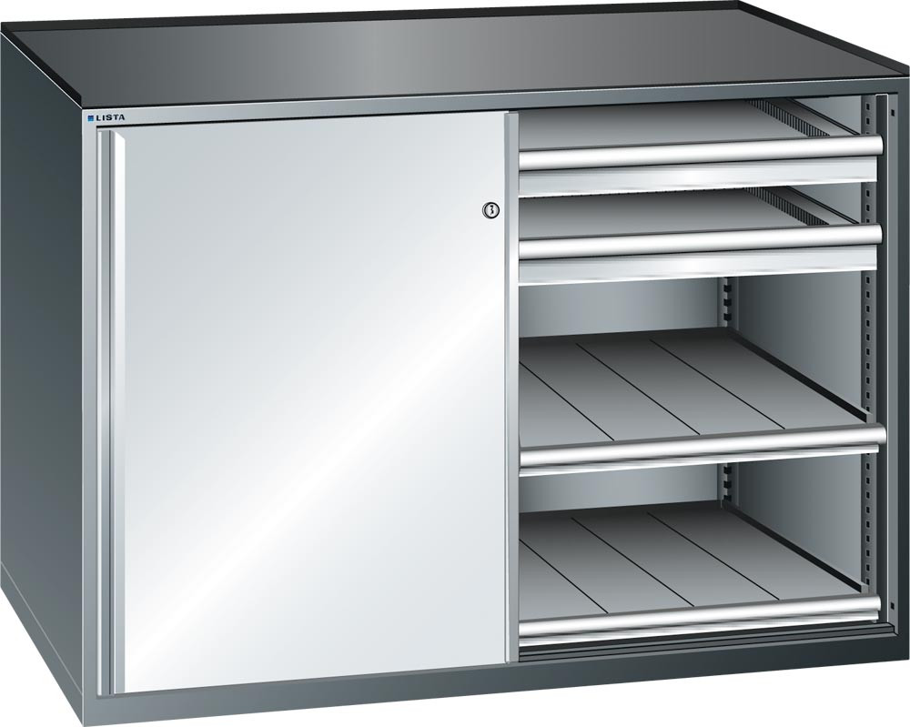 ∙ Aus hochwertigem, pulverbeschichtetem Stahlblech ∙ Optimal bei engen Raumverhältnissen ∙ Schiebetüren mit einer hohen Laufruhe ∙ Inneneinrichtung im 25 mm Raster in der Höhe verstellbar ∙ Mit Zylinderschloss ∙ Abrollrand 3-seitig inkl. Rillenmatte