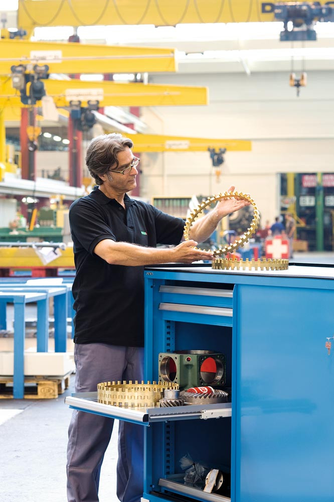 Schubladenschrank m. Schiebetüren, BxTxH 1430x780x1020 mm, 4 Schubladen 75 u. 4 Auszüge 200 kg, Schloss, RAL 7035