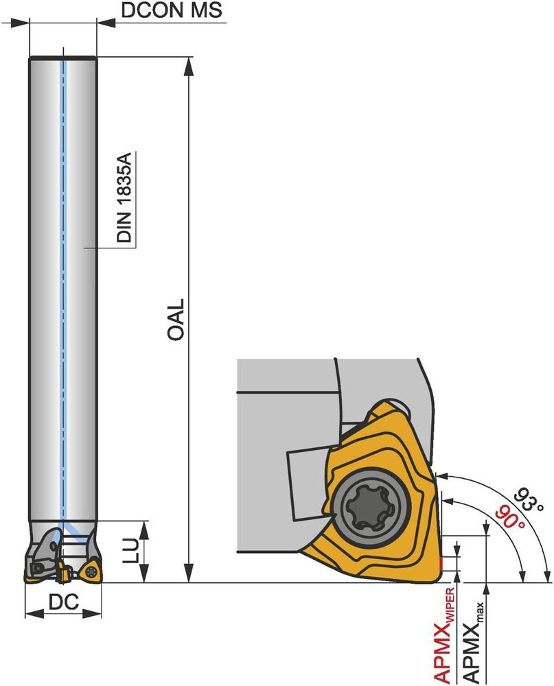 Plan-Kopierfräser mit doppelt negativer Geometrie welche 2 aus WNHX0403.. doppelseitige Wendeschneidplatte · Schneiddurchmesser 16mm mit 90° Anfahrwinkel und 14mm Zylinderschaft gemäß DIN 1835A · 140mm funktional und · durchgehende Kühlung zum Planfräsen · flachen Schulterfräsen · tiefen Schulterfräsen · Tauchfräsen · Kopierfräsen und Rampen mit einer maximalen Schnitttiefe von 0,5 (2,0)mm