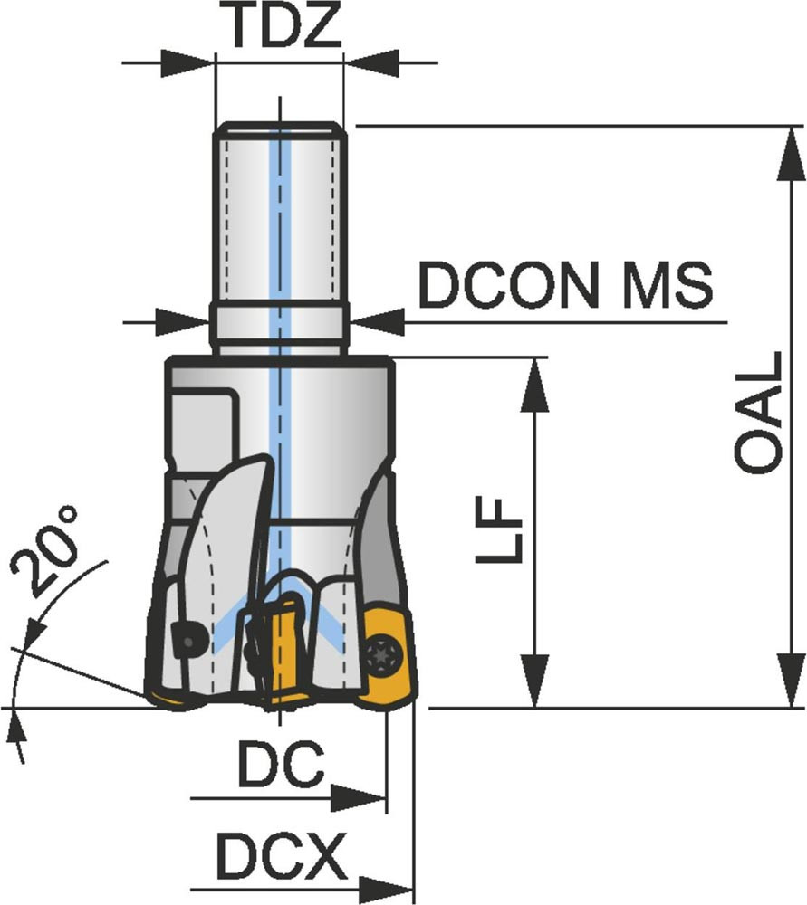 Hochvorschubfräser mit positiver/negativer Geometrie zum spannen von 5 Stück BNGX 10T3.. oder ANHX 10T3.. Wendeschneidplatten · Schnittdurchmesser 28mm mit 20° Anstellwinkel und M12 Gewindeschaft für modulare Standardhalter · 35mm Überstandslänge · Kühlkanalbohrung und ungleiche Teilung zum Planfräsen · Kopierfräsen · flachen Schulterfräsen · Rampen · Helikalen Fräsen · Tauchfräsen und progressiven Eintauchen mit einer maximalen Schnitttiefe von 1.0mm