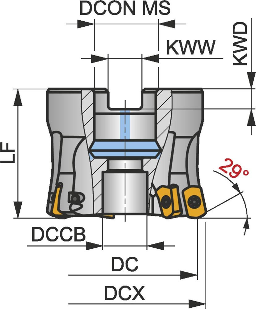 Hochvorschubsfräser mit doppelt negativer Geometrie welche 7 aus BNGX 10T3.. Wendeschneidplatte · Schneiddurchmesser 47mm bis maximal 52mm mit 29° Anfahrwinkel und 22mm Bohrung gemäß DIN 8030-A · 40mm funktional und · durchgehende Kühlung und ungleicher Teilung zum Planfräsen · flachen Schulterfräsen · Tauchfräsen · Kopierfräsen · Rampen · progressiven Tauchfräsen und helikalen Fräsen mit einer maximalen Schnitttiefe von 1mm