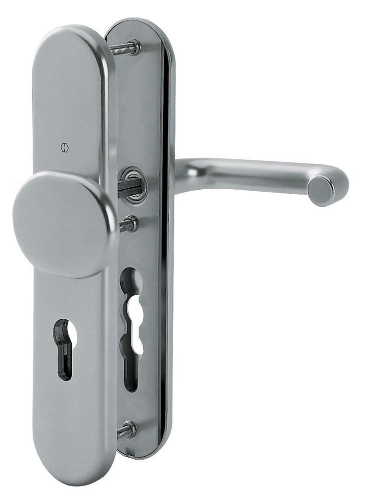 für Abschlusstüren · einbruchhemmend nach DIN 18257 · Knopfschild-Randhöhe: 12 mm · Stahlunterkonstruktion im Innen- und Außenschild · mit Rückholfeder-Paket · mit Schnellstift-Verbindung · DIN links / rechts verwendbar · hochfeste, verdeckte Verschraubung · einschließlich Befestigungsmaterial · Lochung PZ · Widerstandsklasse ES 1