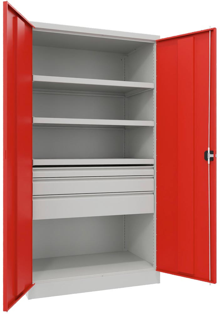 Schwerlastschrank, Vollblechtüren, ohne Trennwand, 3 Böden, 200 kg Traglast, 2 Schubl. 175 mm, BxTxH 1040x630x1950 mm, RAL 5010 EP562207