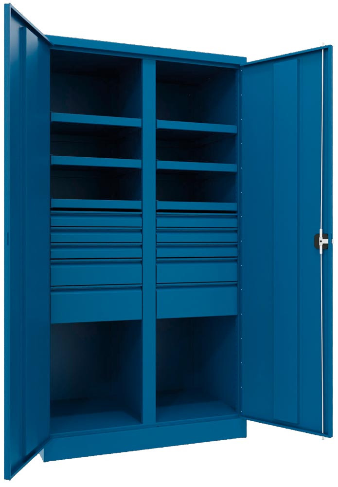 Schwerlastschrank, Vollblechtüren, ohne Trennwand, 3 Böden, 200 kg Traglast, 2 Schubl. 175 mm, BxTxH 1040x630x1950 mm, RAL 5010 EP562207