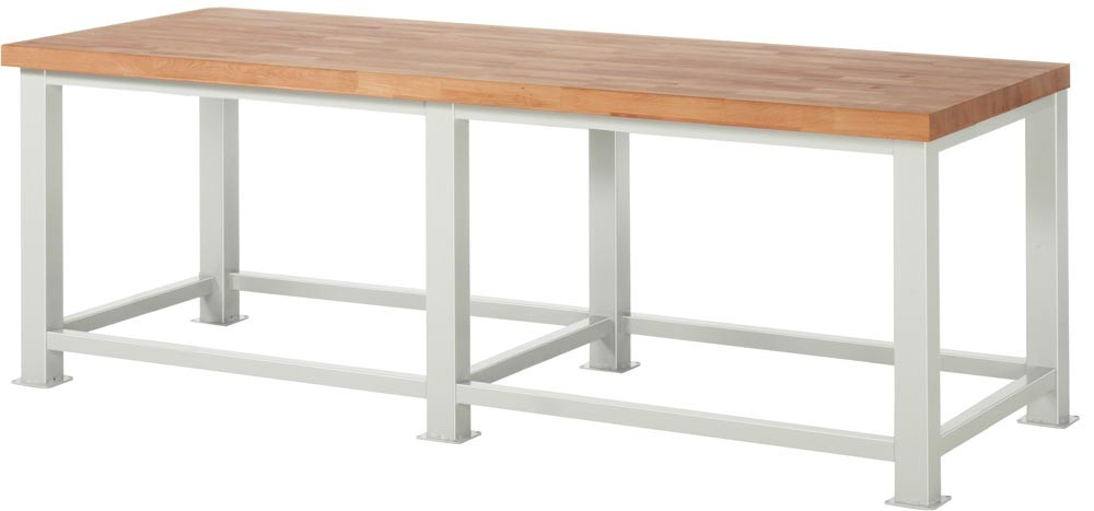 ∙ Buche-Massiv-Arbeitsplatte Stärke 50 mm · Oberflächenschutz durch umweltfreundliches Lackleinöl ∙ Stabile und verwindungsfreie Schweißkonstruktion aus Profilstahlrohr 80 x 80 x 3 mm mit Tiefenverstrebungen und Fußplatte (120 x 120 x 5 mm) mit Bodenverschraubmöglichkeit ∙ Querstreben aus Profilstahlrohr (45 x 45 x 2 mm) ∙ Flächenlast 2500 kg ∙ Umweltfreundliche Pulverbeschichtung: Gestell RAL7035 lichtgrau