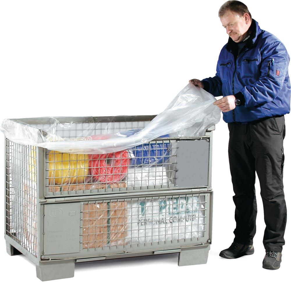 HD-PE, naturtrüb, Stärke 25 µm · regeneratfrei · Reiß- und Durchstoßfest · als Inlet oder Haube für Gitterboxen, Kartons und Paletten bis 1375 mm Höhe · hervorragender Schutz vor Staub und Feuchtigkeit · VE = 125 St. auf Rolle