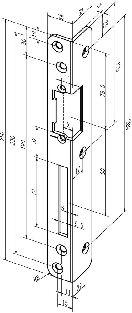 mit Fallen- und Riegelausschnitt · Meterrissmarkierung · 3 mm Materialdicke · mit zusätzlicher Befestigungsbohrung · für gängige eff-eff-Standard-Türöffnermodelle außer ProFix®-Varianten