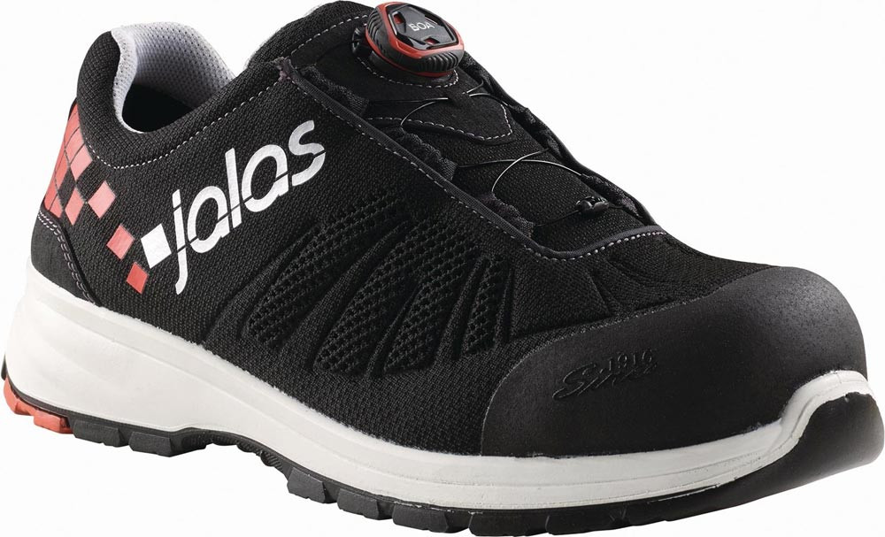 nach DIN EN ISO 20345:2011 · S1P SRC · funktionales Obermaterial aus Textilstrick mit Memory-Schaum-Polsterung schützt die Füße und hält sie angenehm kühl · JALAS® Zehenschutzkappe aus Aluminium · die öl- und hitzebeständige RPU-Laufsohle bietet optimalen Grip · der plasmabehandelte, textile Durchtrittschutz und zwei Stoßdämpfungszonen aus PORON® XRD® schützt die Füße zuverlässig