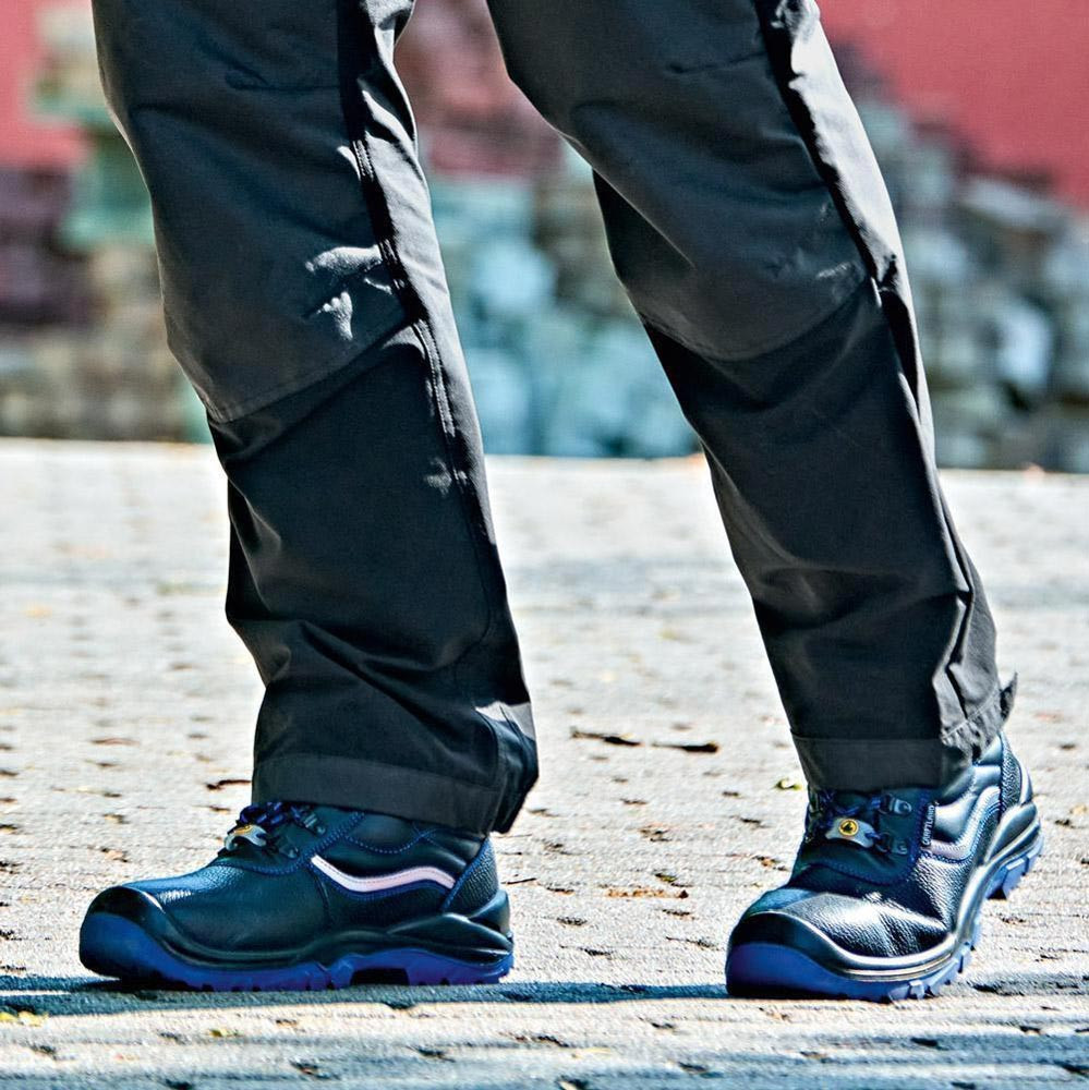 nach EN ISO 20345 · S3 FO SR ESD · Schaft aus leicht geprägtem Leder · ergonomisch gepolsterter Kragen · gepolsterte Staublasche · Verschluss durch Triangels und Rundsenkel · blaues atmungsaktives 3D-Innenfutter · herausnehmbare, antistatische High-Poly Einlegesohle · Reflexstreifen auf beiden Seiten · korrosionsfreie Stahlkappe und duchtrittsichere Stahlzwischensohle · antistatische, öl- und säurebeständige, rutschhemmende 2-Schichten-PU-Sohle · blaue Laufsohle · nicht kreidend · integrierte Überkappe · Schuhweite: 10,5 · Einsatzbereich: Bauwirtschaft, Handwerk, Industrie, etc.