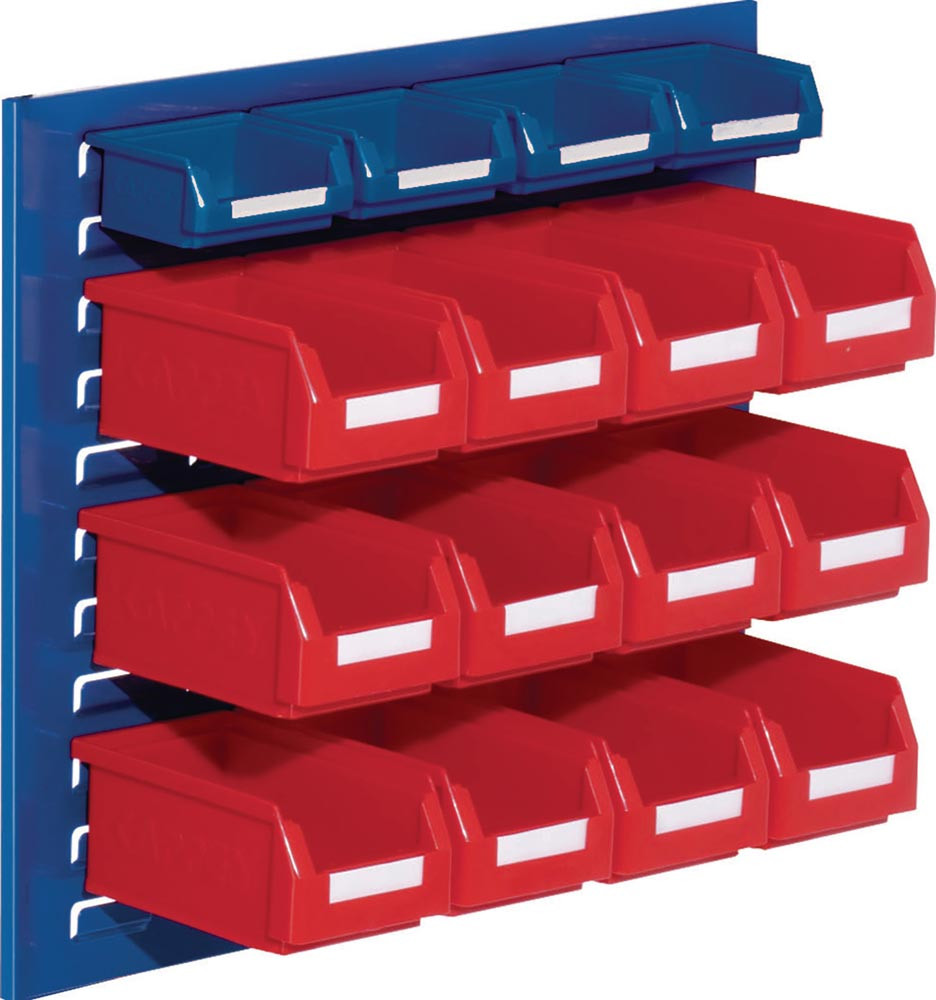 bestehend aus: Schlitzplatte, Stahlblech enzianblau, RAL 5010 und Lagersichtkästen, inkl. Etiketten