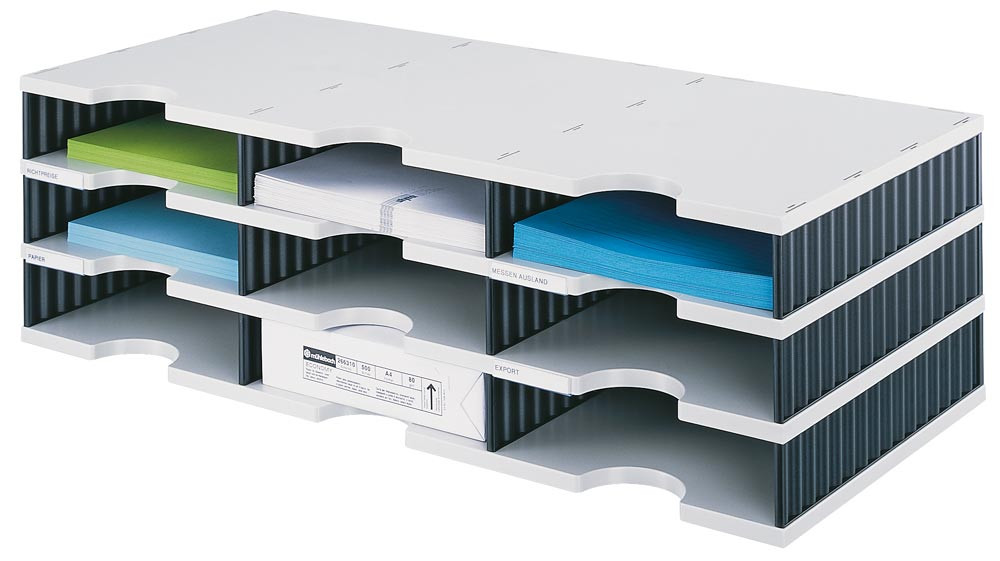 · Zur Verwahrung von Kopierpapier, Zeitschriften, etc. oder als Postsortieranlage · Durch Aufbaumodule jederzeit erweiter- und kombinierbar · Aus hochbelastbarem Polystyrol · Boden in grau, Seitenteile farblich abgesetzt · Inkl. Beschriftungsschilder · Anlieferung erfolgt zerlegt im handlichen Karton