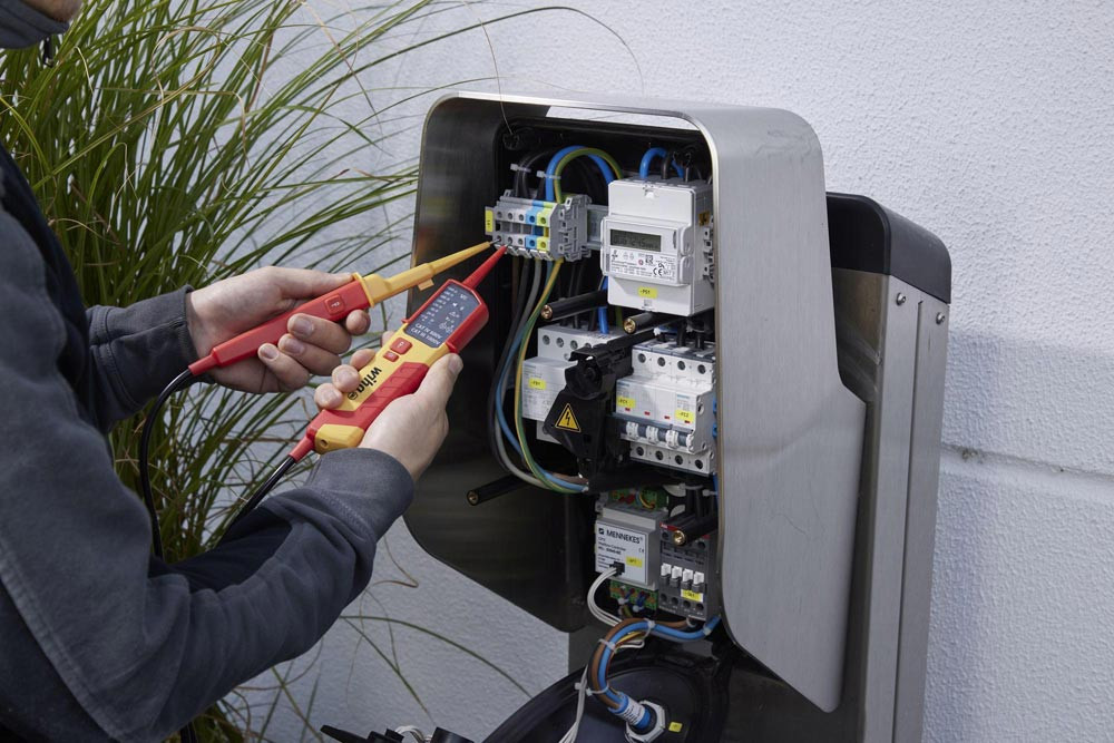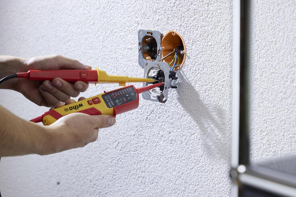 schnelle Einhandprüfung an Netzsteckdosen durch 19 mm Kontaktabstand · integrierte Taschenlampenfunktion sorgt für optimale Lichtverhältnisse. · Überprüfung der FI-Auslösung durch zwei Lasttasten · Spannungsprüfung im komfortablen Messbereich von 12 bis 1.000 V AC bzw. 1.500 V DC · zusätzlich bietet er die Möglichkeit der Durchgangsprüfung der optischen Drehfeldprüfung, der Einpolprüfung sowie der automatischen Polaritätserkennung · Messergebnisse sind dank einer LED-Anzeige einfach ablesbar ·ein zusätzlicher Signalton signalisiert den Stromfluss bei der Durchgangsprüfung · außerdem kann die Prüfung an Steckdosen komfortabel mit Hilfe des integrierten Abstandhalters einhändig durchgeführt werden · gleichzeitiges Drücken der Tasten an beiden Griffen der Prüfspitzen ermöglicht die Funktionsprüfung des FI-Schutzschalters durch das Zuschalten einer Last · gemäß den Messkategorien CAT III bis 1.000 V und CAT IV bis 600 V bietet der Spannungs- und Durchgangsprüfer maximale Sicherheit für Arbeiten im Bereich der Gebäudeinstallation sowie direkt an Quellen der Niederspannungsinstallation. IEC/EN 61243-3:2014 · IP64